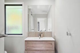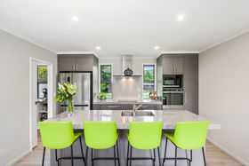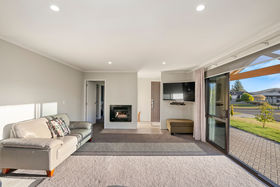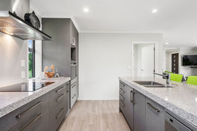 The design of this kitchen ensures the clutter will be kept well out of site with a walk-in pantry to one side and a separate laundry room with double storage cupboards on the other .The island bench and breakfast bar is definitely the heart of the home and adds beauty as well as functionality with its deep engineered stone top with extra power points to the side. An induction hob sits below a porcelain sheet splashback and no space is wasted with cupboards to the ceiling. Windows on both sides of the rangehood have views to the garden and with the open plan living having glass sliders to the patio there is always an outlook to enjoy. This room is heated by a heatpump and built-in woodburner which is connected to a wetback while the impressive storage continues with another double linen cupboard in the hall and double cupboards in the carpeted garage. Both bathroom and en-suite have tiled wet area showers with the master having sliding doors to the patio.