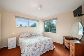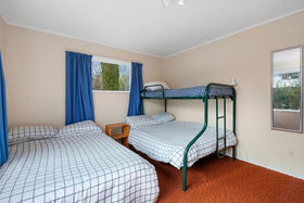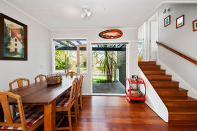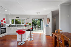 French doors open to a private rear patio with barbeque area with a designated spot for parking a caravan and connecting to power. Morning sun streams into this modern kitchen that has sliders over the bench-top, a breakfast bar, tiled up-stand, and glass splash-back. Appointments include gas hot water and hob, a dishwasher, and waste disposal. But the showpiece just must be the rich expanse of polished Matai flooring that adds lustre and warmth to the kitchen- dining, stairwell and lounge. Rich in colour and tough as nails it adds an ambiance that harks back to the days when a Bach was a Bach. Relaxing, unpretentious, kick off your shoes, kind of style.
