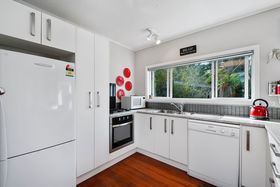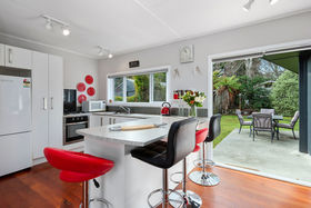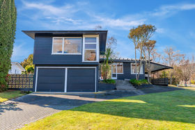 The upper level includes master with renovated en-suite and lounge with large picture windows showcasing views to the bush-clad hills and the local area. Rain or shine it is a fun spot to catch up with friends and enjoy the views. On the ground floor the other wing has two more bedrooms and a combined bathroom laundry with internal access to the double garaging. An exterior refurbishment included a full repaint and new cobbling on the driveway.