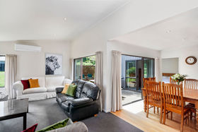 Relaxed living will be the order of the day with this flexible floor-plan. With the living zone, TV room and master all having glass sliders to the garden there are multiple entry points to the grounds. A sunny, sheltered courtyard will be a happy patio nook for coffee and can be accessed on three sides with the handy u-shaped kitchen facing this area. The front door has a covered entrance and there is spacious living with raked ceilings and a study to the side. The raked ceilings continue in the hall where two double bedrooms are separated by a cosy TV room. Storage is a feature with two double linen cupboards and the office having a built-in closet as well so it can be used as a fourth bedroom if required.